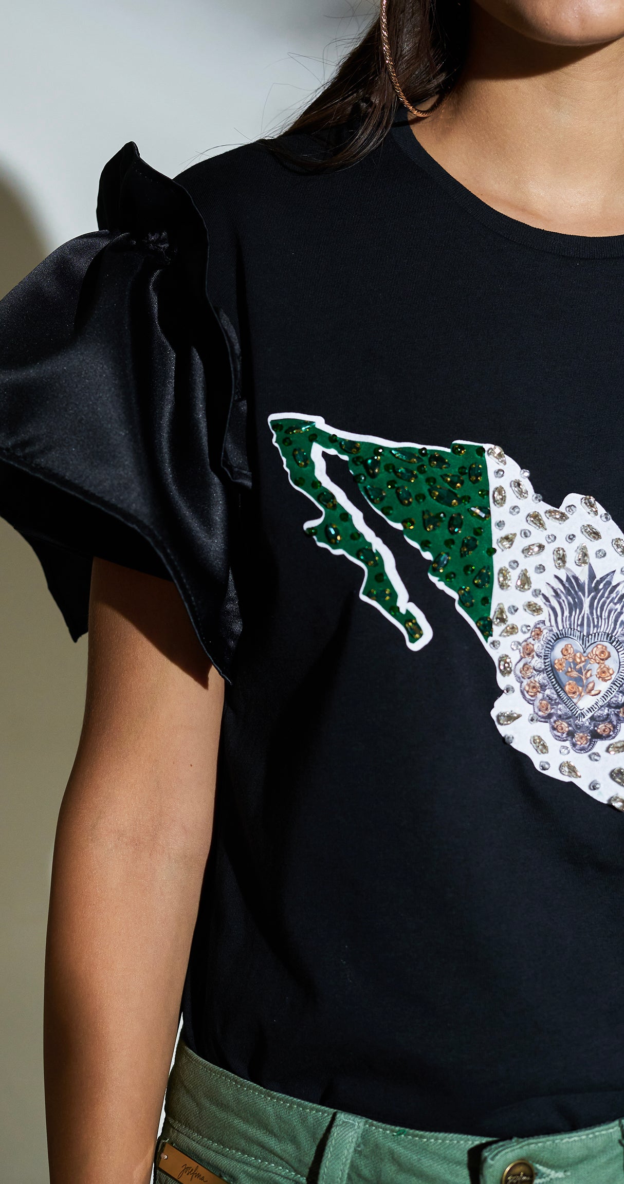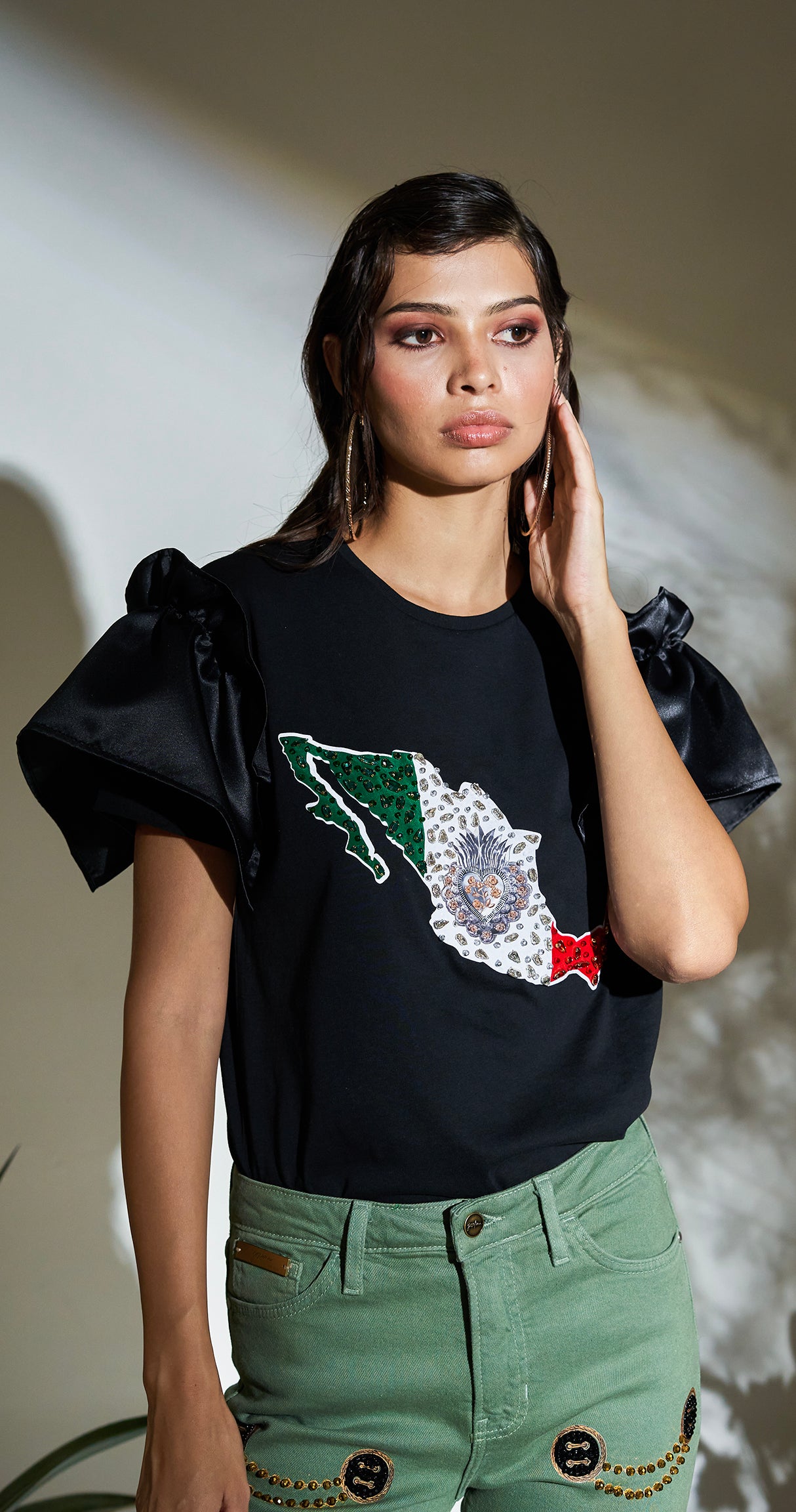 BLUSA DE ALGODÓN CON MANGAS DE POPELINA, CON MAPA EN TRES TONOS, CON SAGRADO CORAZÓN, BORDADO CON CRISTALES