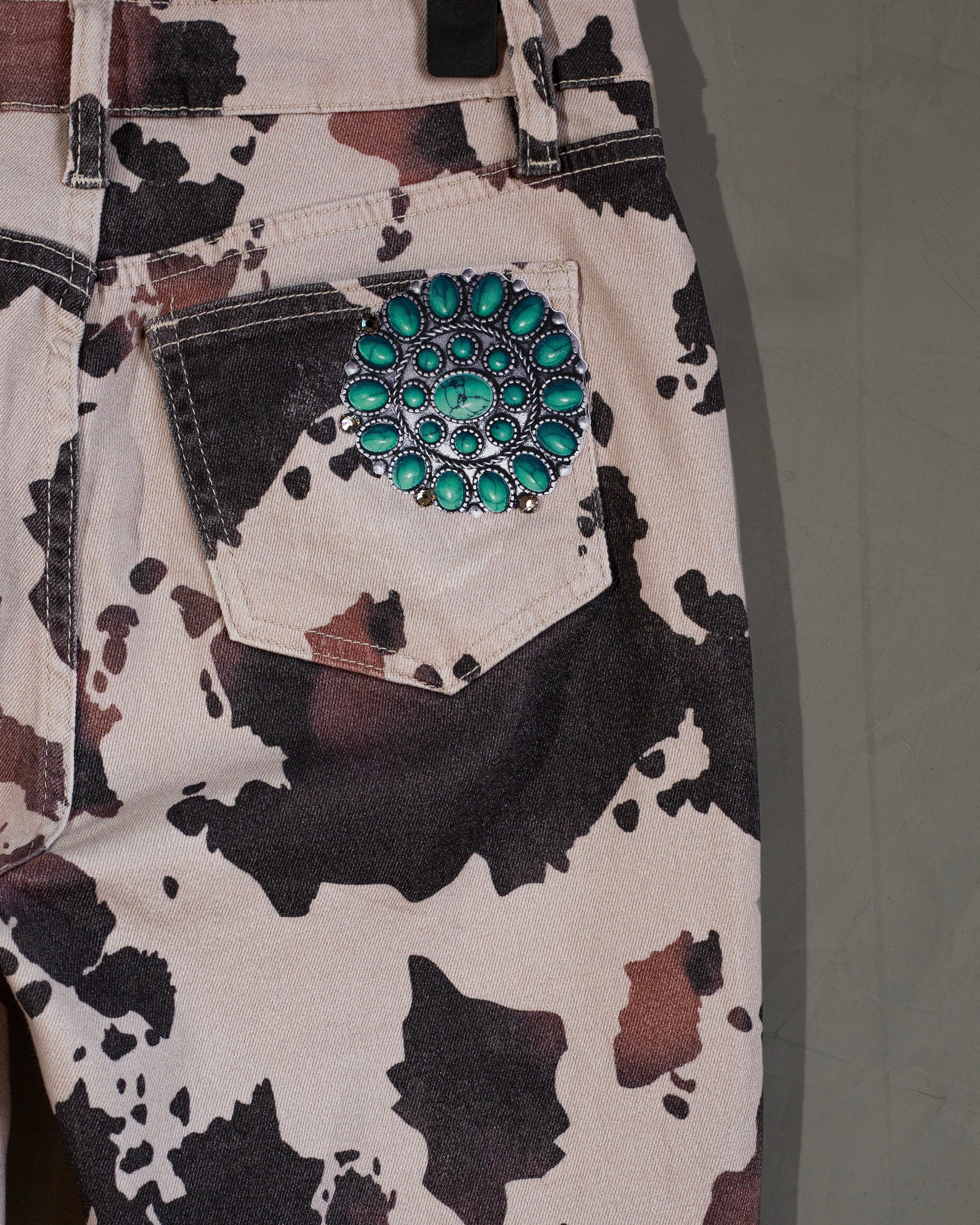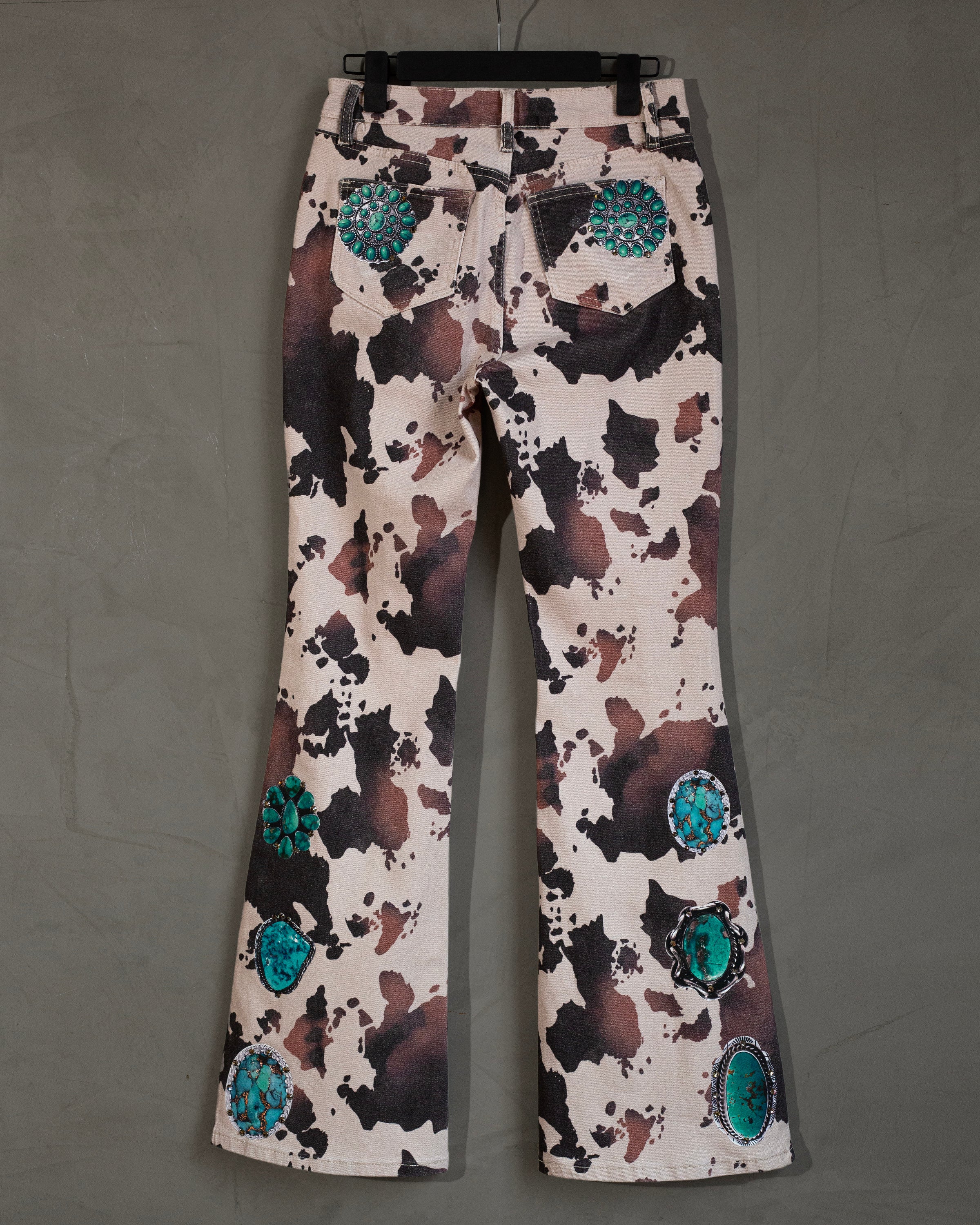 Pantalón de mezclilla con estampado de vaca, con turquesas estampadas