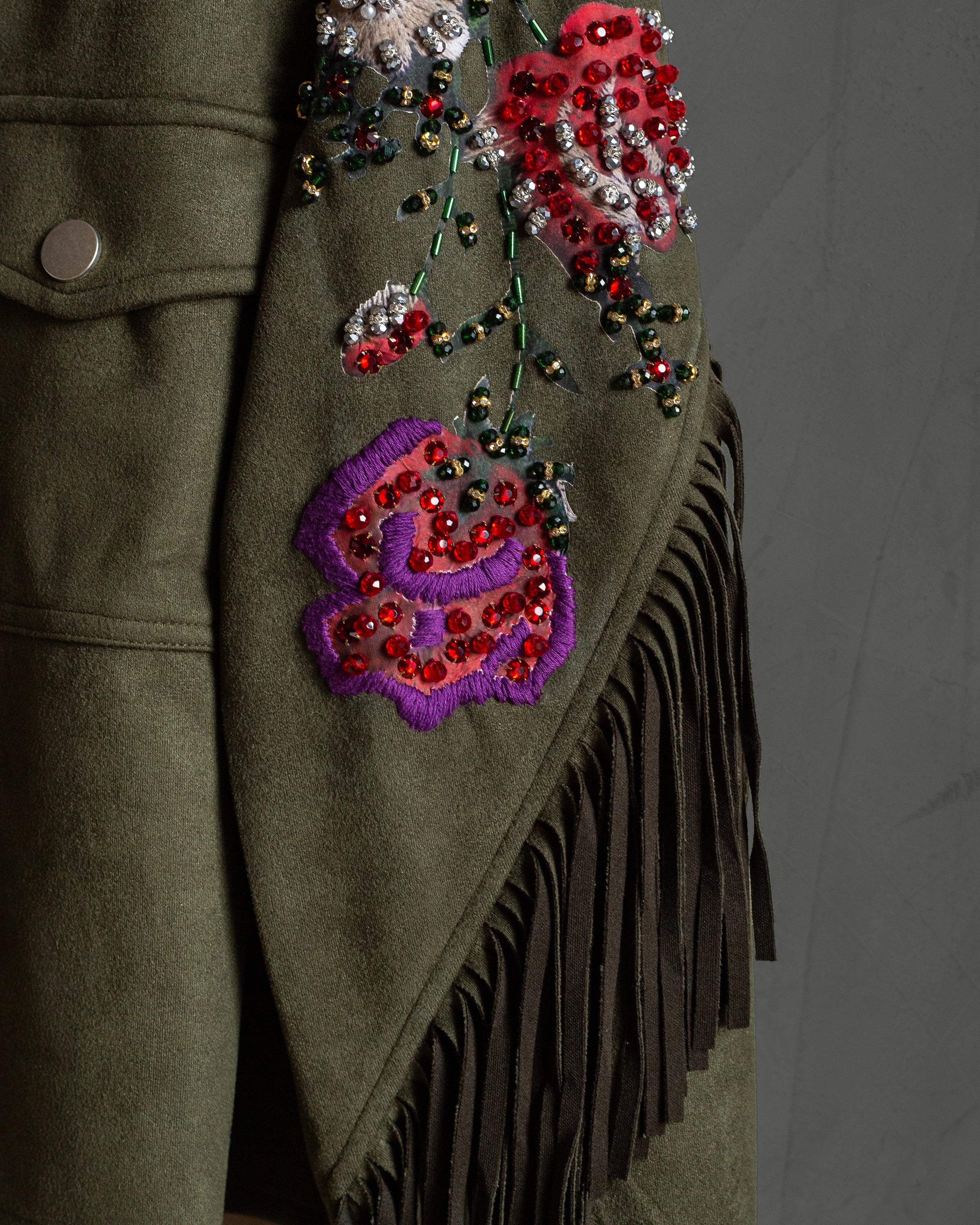 Chamarra verde de gamuza con flecos y flores bordadas a mano