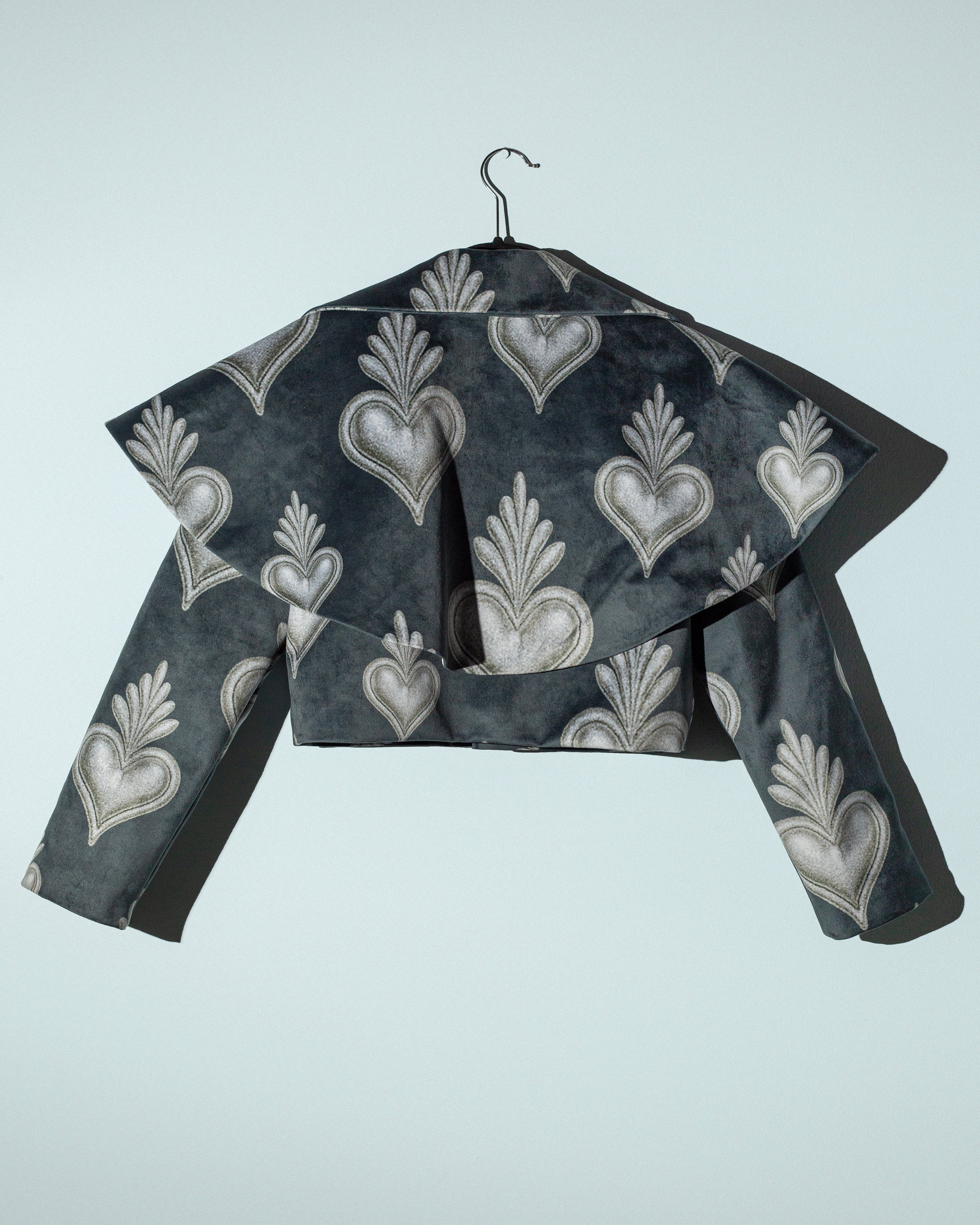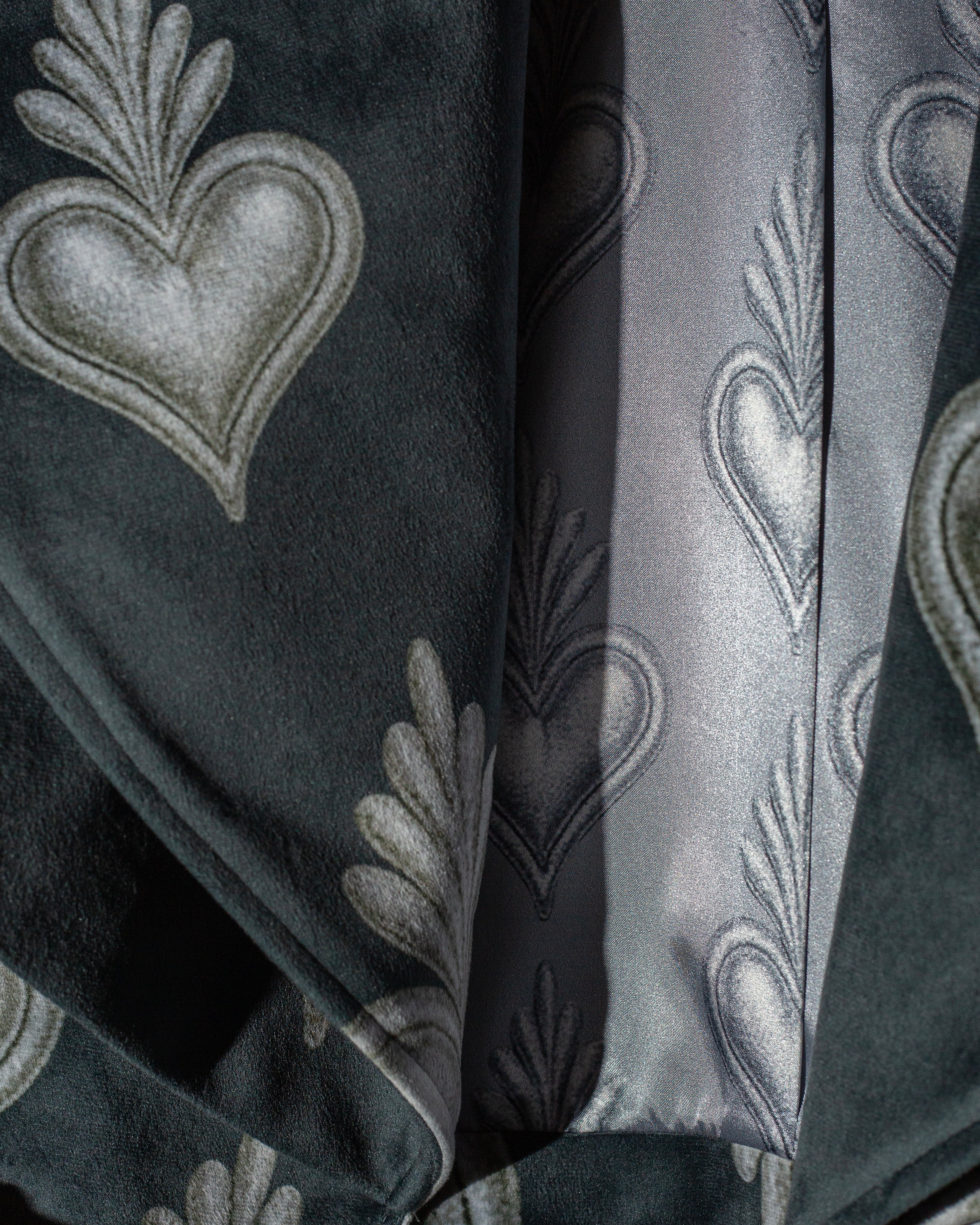 Gabardina de terciopelo a la cintura con doble solapa, con estampado de corazones