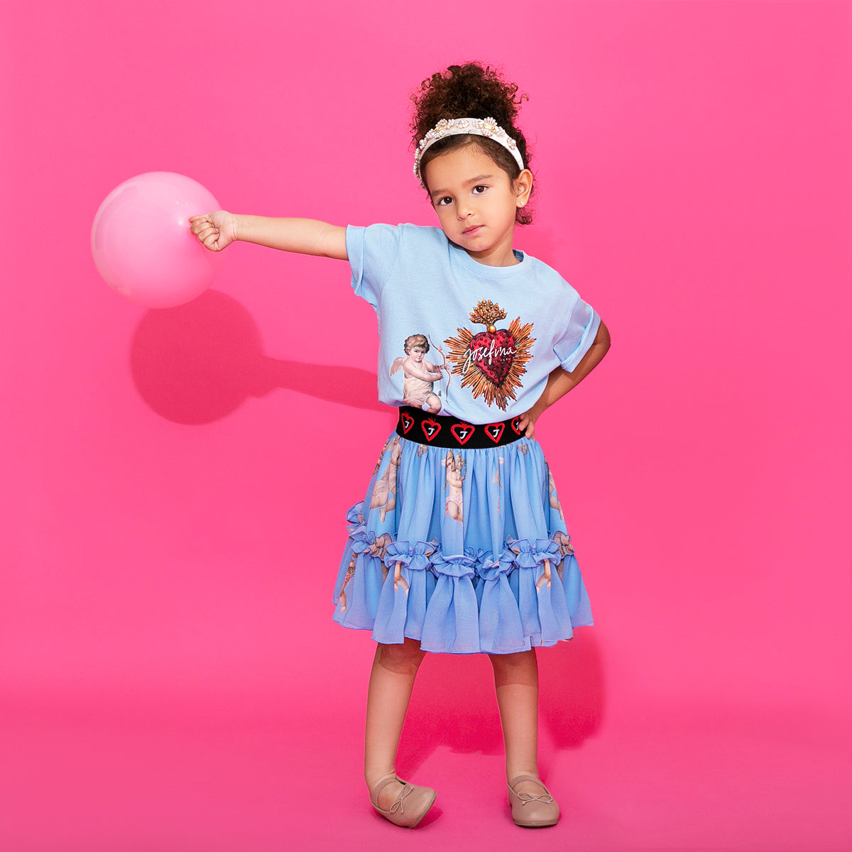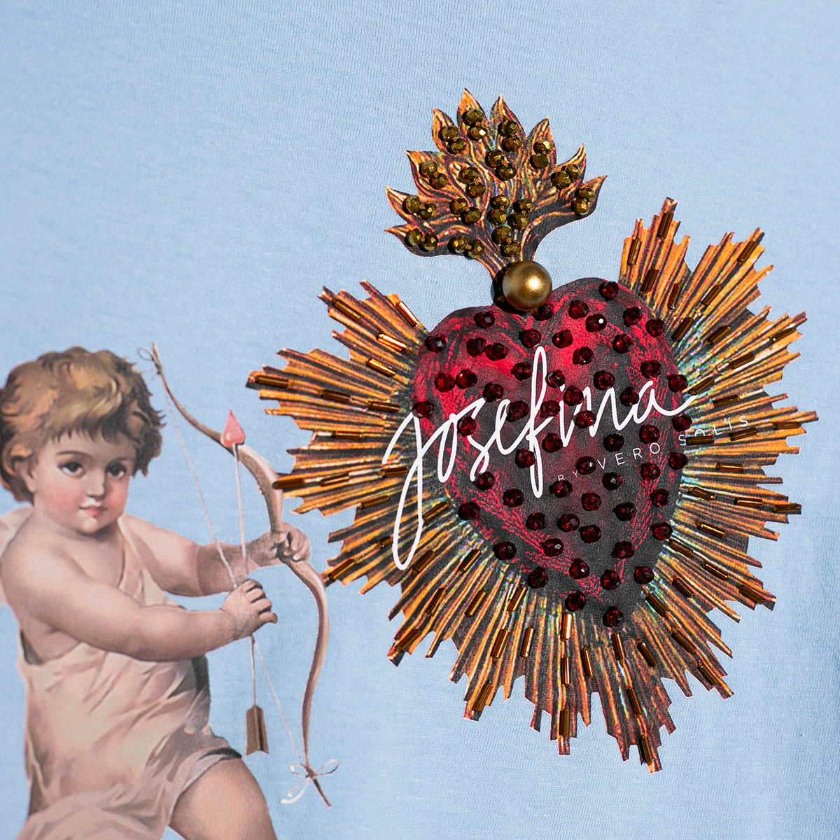 Camiseta de algodón con imagen de cupido y el Sagrado Corazón de Josefina bordado a mano con cristales y canutillo
